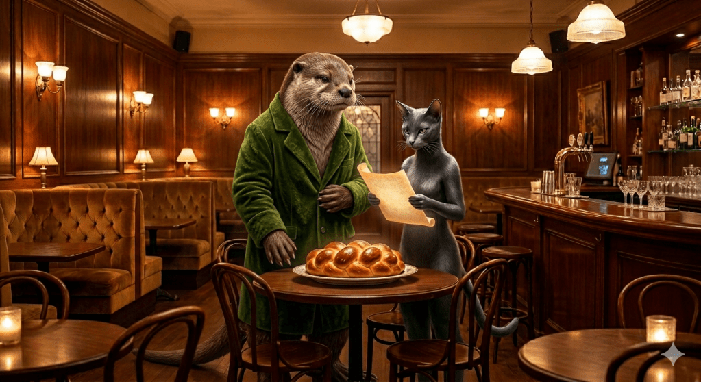 But the heart of the evening beat in the main booth. As is tradition, Nettan Miau (the sleek, ancient feline entity known to many) reading a blessing from the scrolls. Though the words were not Hebrew, they carried its ancient, deep, moving weight, bathing the entire room in a profound peace. She was accompanied by her quiet, constant companion, Adriel, known to all simply as Moss-Ad. A textured otter entity in a tailored, velvet moss-green coat, his rugged, ‘seen-it-all’ presence was the bedrock for her grace.
