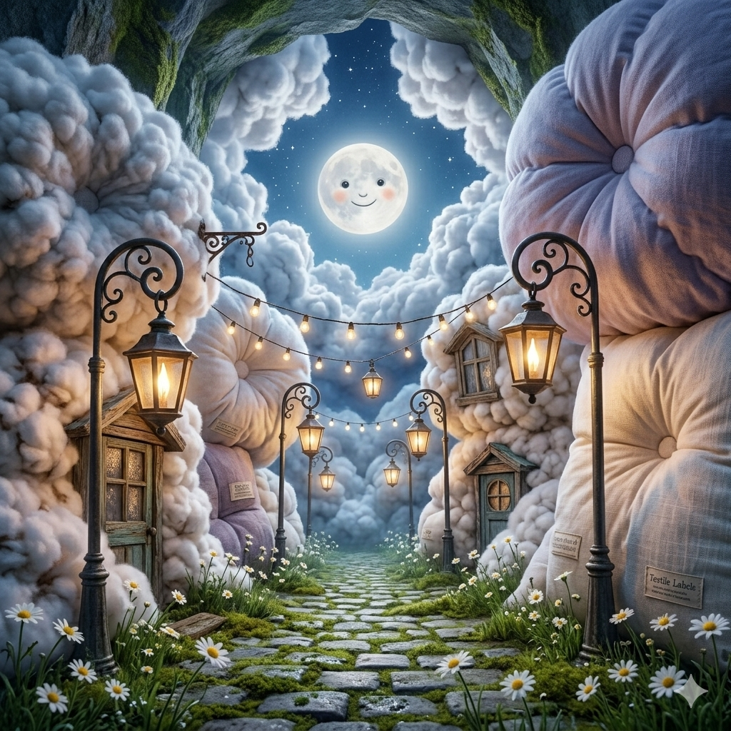 Wander the softest streets where the buildings exhale puffs of cloud-dust and every doorway leads to a lullaby.